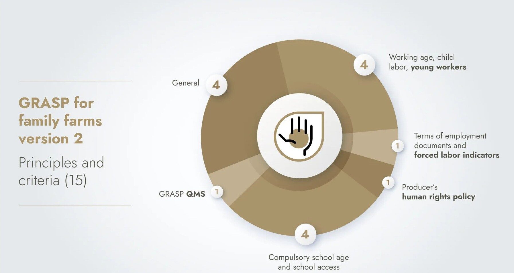 GRASP is applicable to farms of all types and sizes, from smallholders to larger cooperatives, producers with hired or subcontracted labor to family farms. To account for the unique situation of family farms (farms that only have core family members working on them, with no hired labor), they are evaluated according to an abbreviated checklist with fewer P&Cs (15 in total). The rest of the P&Cs that are not applicable to family farms are removed.